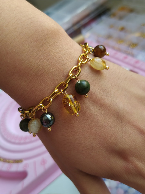 Brazalete de acero inoxidable con ámbar ,citrino , hematita,jade nefrita y ojo de tigre .16 CM largo + 4 CM de extensión.