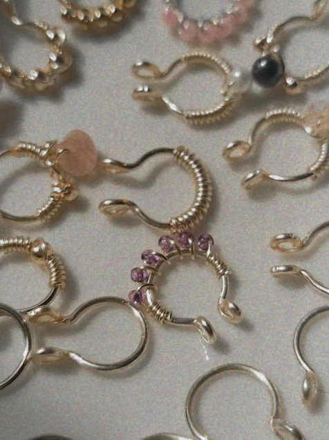 Última pieza de simulador septum con chaquiras ,alambre en 14k .