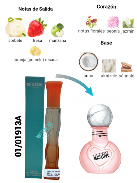 Un perfume que te cautivará con sus notas frutales de fresa y manzana, un corazón floral de peonía y jazmín, y un fondo cálido de coco, almizcle y sándalo. Un aroma irresistible. ¡Atrévete a sentir el flechazo!