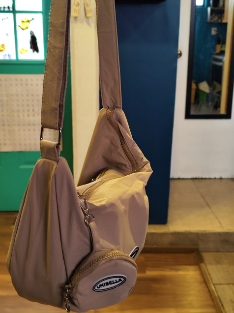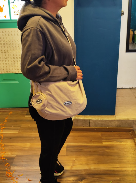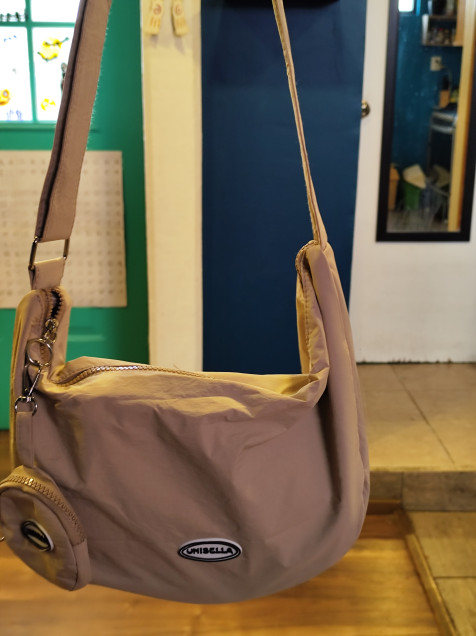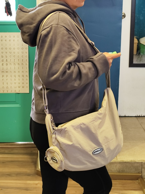 Bolsa media luna tipo HOBO, COLOR BEIGE, INCLUYE MONEDERO