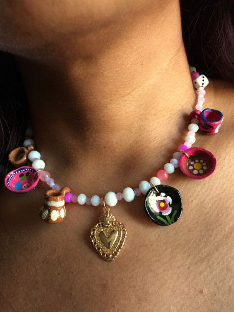 Cuentas de cristal, pendientes de barro policromado y metales mixtos.