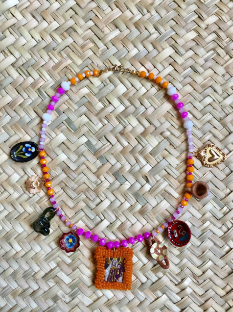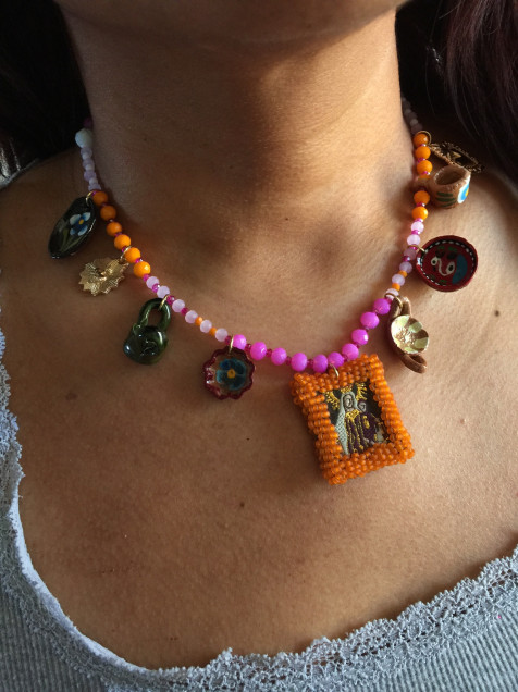 Cuentas de cristal, chaquiras mate, pendientes de barro policromado y metales mixtos.