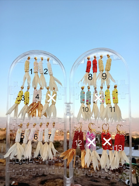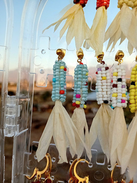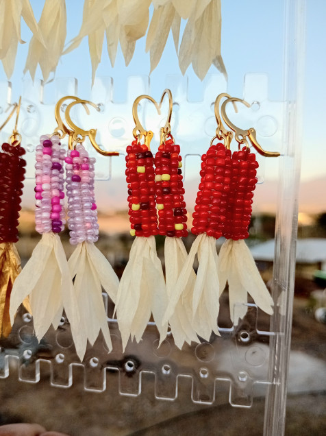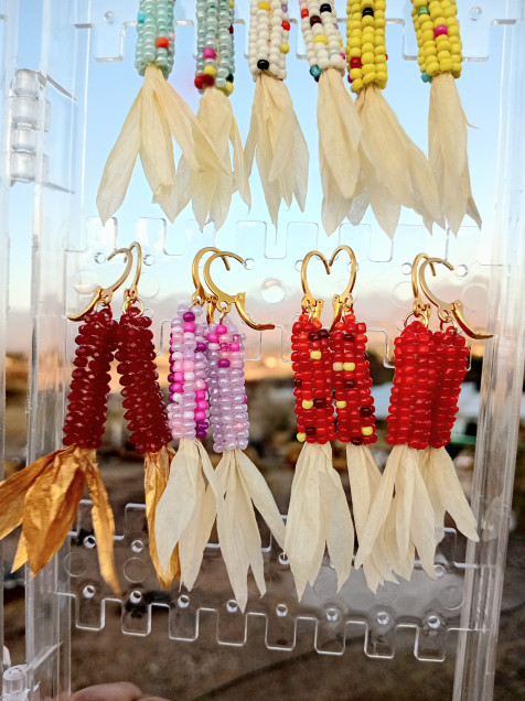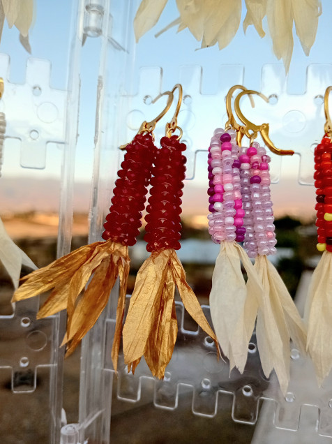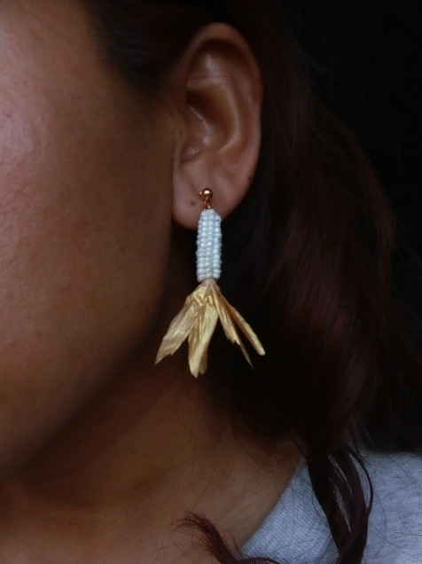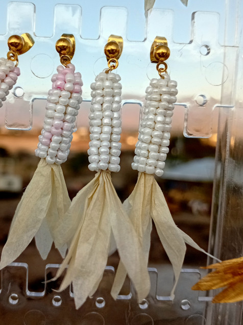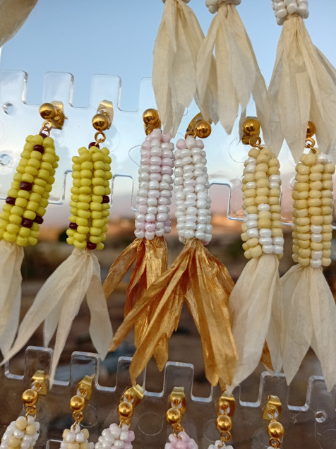 Aretes en forma de elote hechos de chaquiras, papel rafia y acero inoxidable.