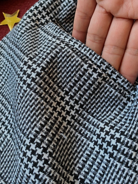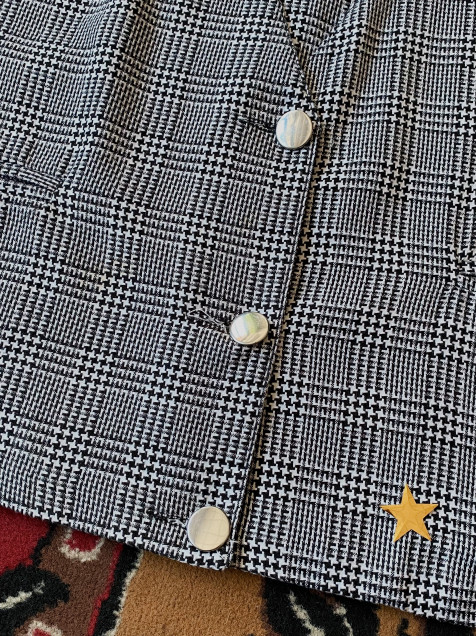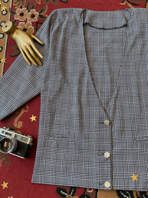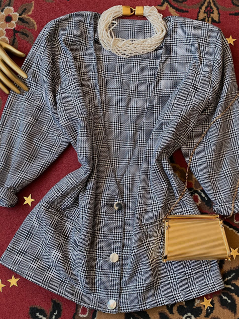 Saco de príncipe de Gales con bolsillos frontales, botones plateados.