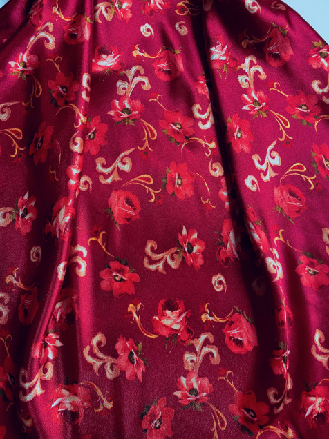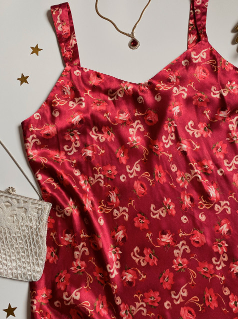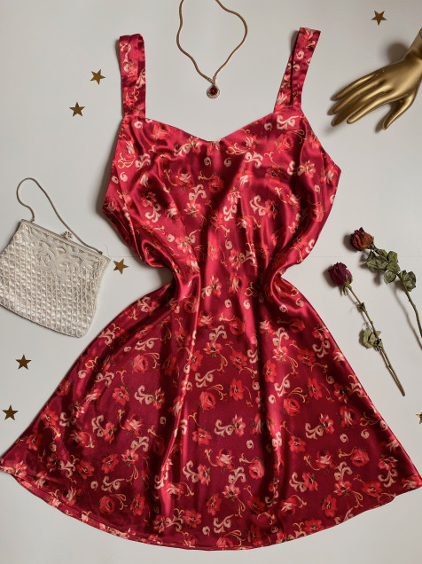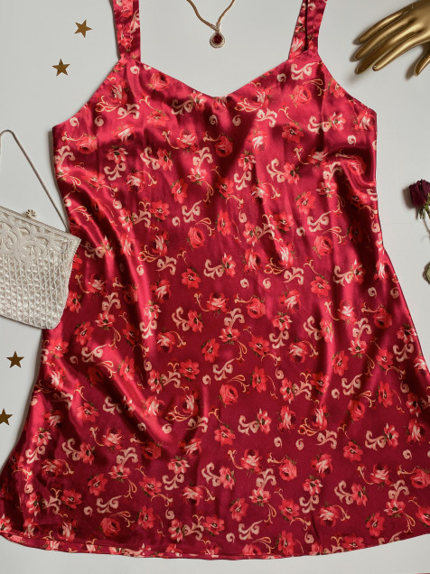 Vestido lencero, rojo frambuesa (color real segunda foto), polyester, satinado en estampado floral y ornamentos. SIN DETALLES TALLA M HOMBRO LIBRE, PECHO 120cm, LARGO 100cm, el estilo es holgado.