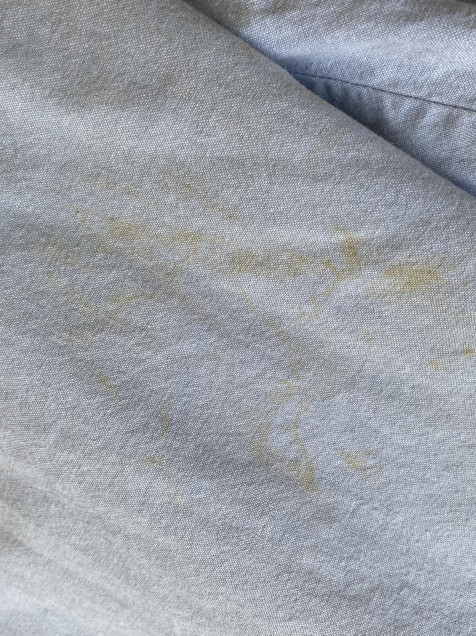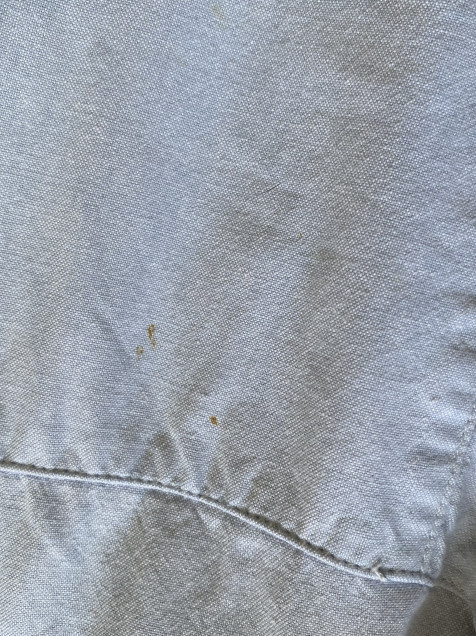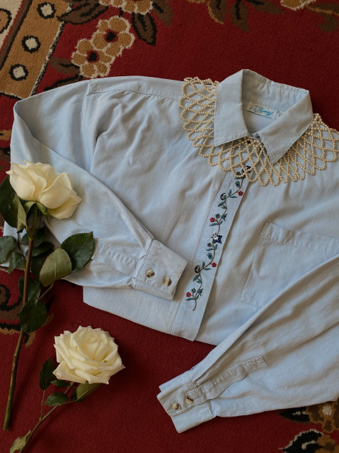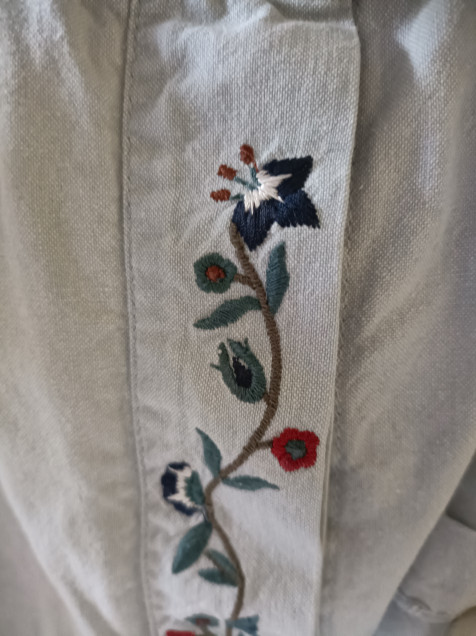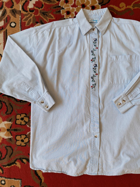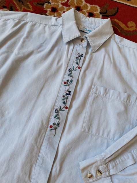 Camisa de algodón, manga larga color azul cielo y bordado de flores en pecho, botones ocultos, bolsillo izquierdo, se ve arrugada pero el algodón suele arrugarse, detalle de unas manchas traseras, tras el hombro y en la parte inferior, se muestra en fotos. TALLA L Hombro: 54cm Manga: 50cm Ancho: 140cm Largo: 72cm