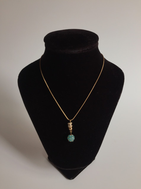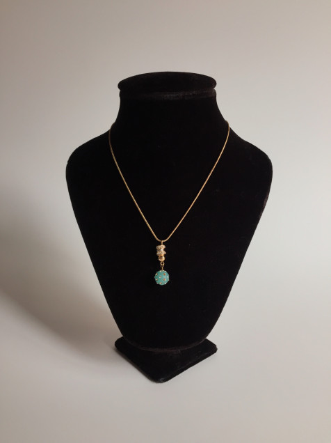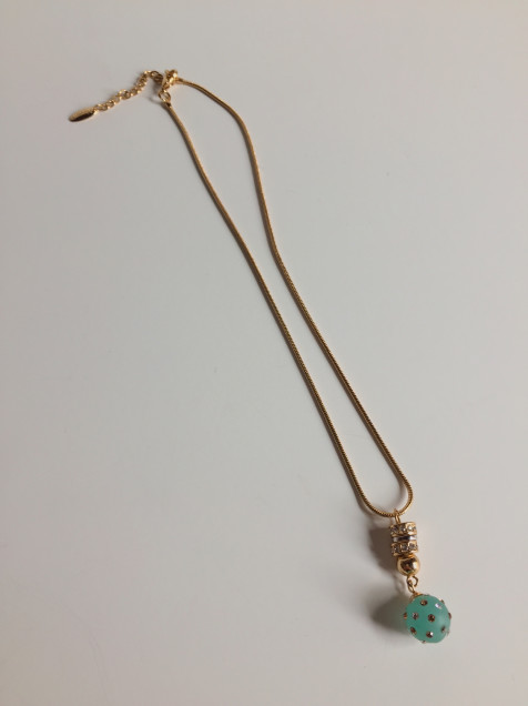 Collar con cadena metálica dorada con broche de gancho y bonito colgante de esfera turquesa de vidrio con incrustaciones de cristales tipo diamantes.