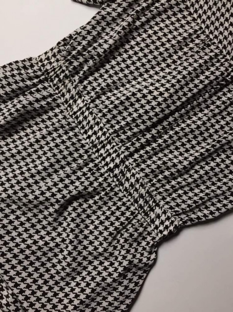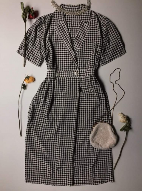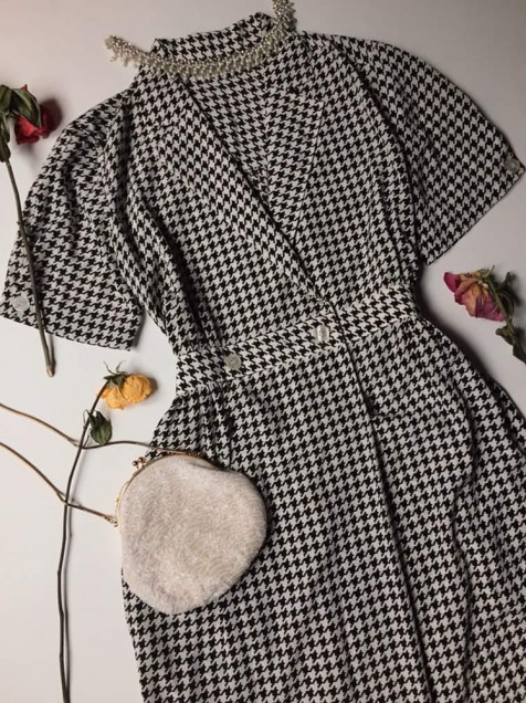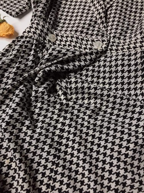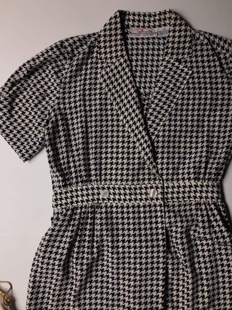 Vestido pata de gallo, tela polyester ligero, manga corta, bolsillos en ambos costados, tiene resorte en cintura trasera que estira levemente, sin detalles.