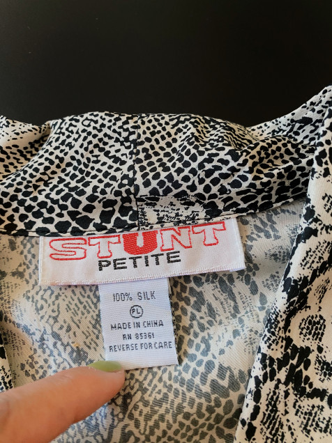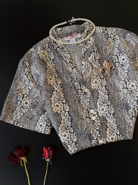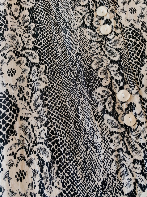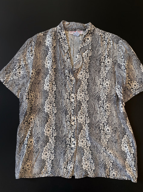 Camisa 100% seda, manga corta con estampado de Animal Print con flores, TALLA S, hombro 40 cm, manga 26 cm, pecho 112 cm, largo 68 cm.