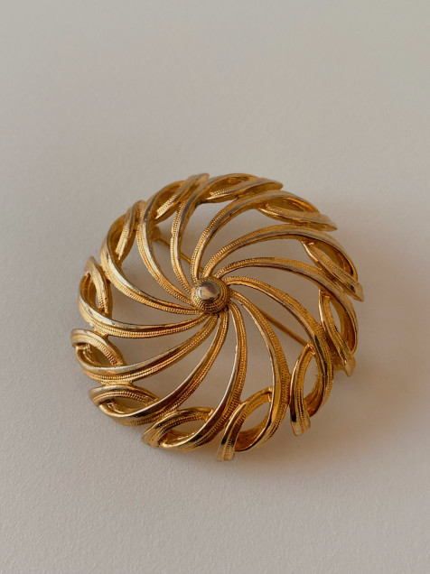 Broche diseño espiral, 5 cm de diámetro metálico dorado el tono puede ser un poco más claro, respaldo de aguja.