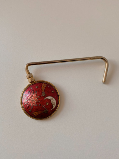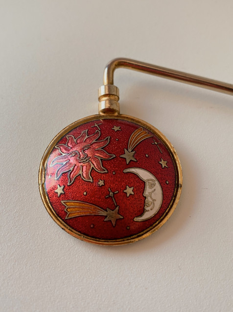 Ganchos de bolsillo diseño Art Noveau, con diseño de Luna, sol y estrellas, esmaltado metálico dorado ya envejecido, desgaste del tiempo 4 cm de diámetro para un largo de 8 cm.