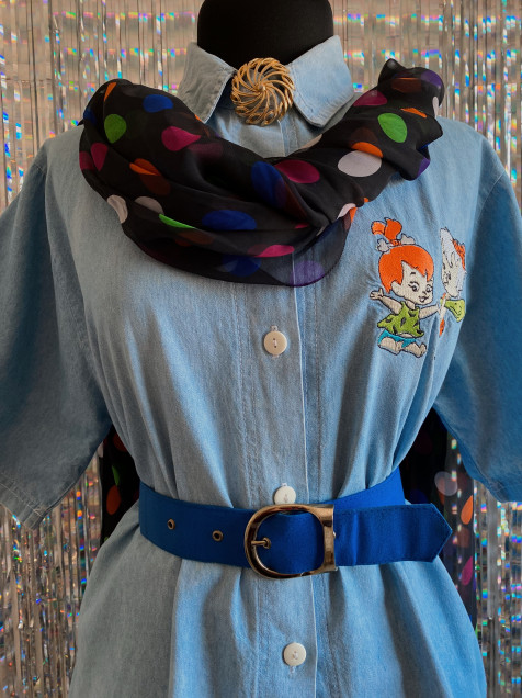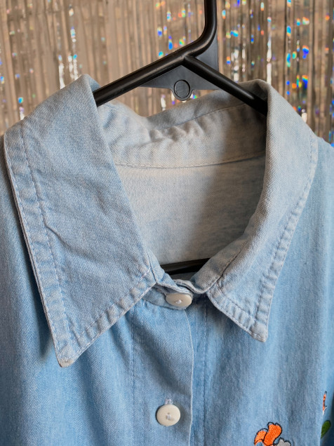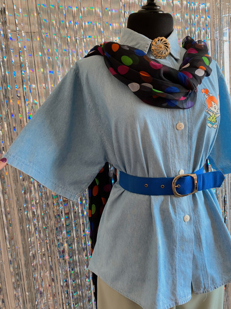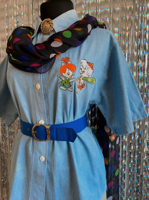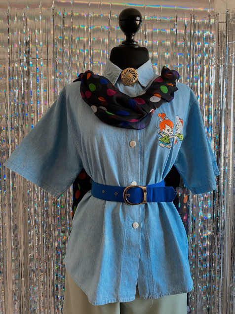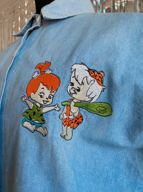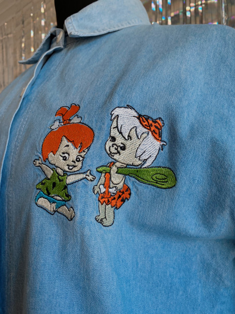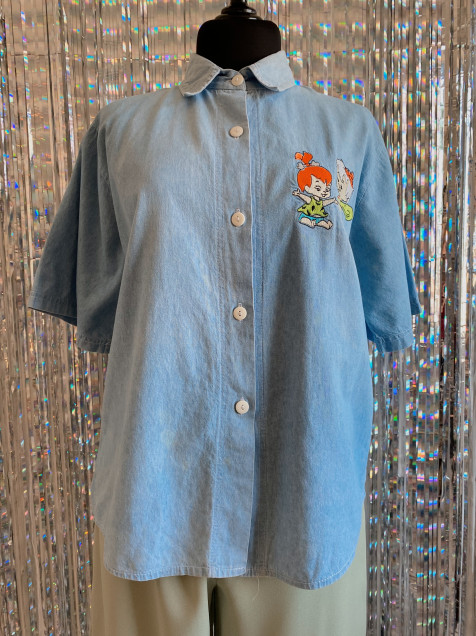 Camisa de mezclilla color azul claro (el azul es más clarito) de manga corta y bordados de Pebbles y Bamm Bamm. Detalle de percudido en el cuello (por dentro) Hombro: 44cm Manga: 28cm Pecho: 110cm Largo: 66cm