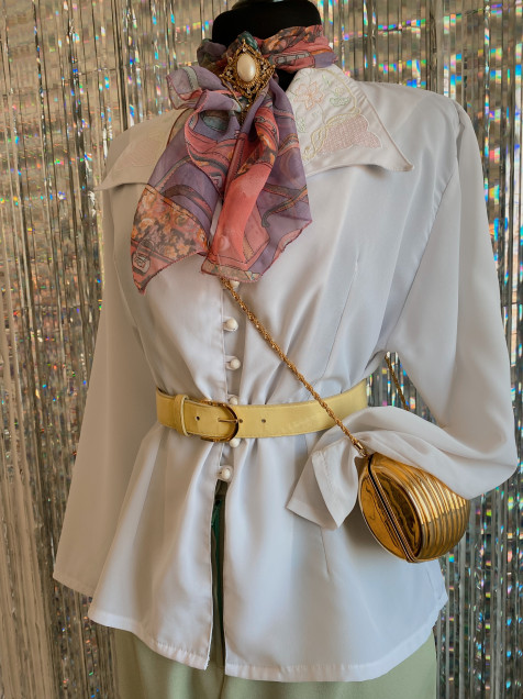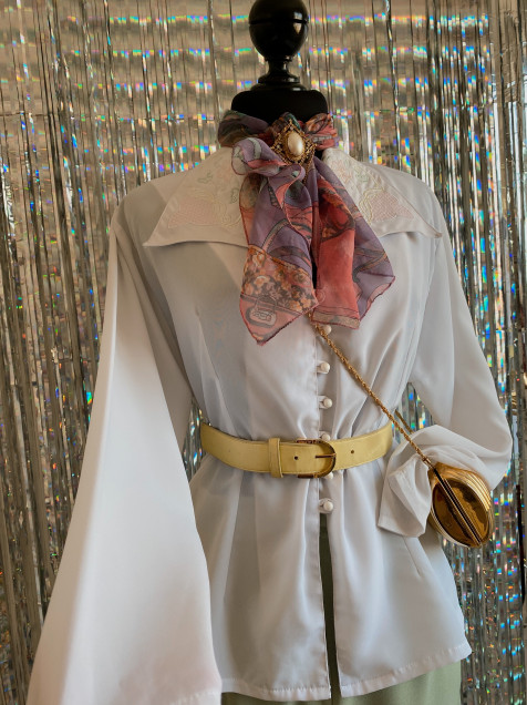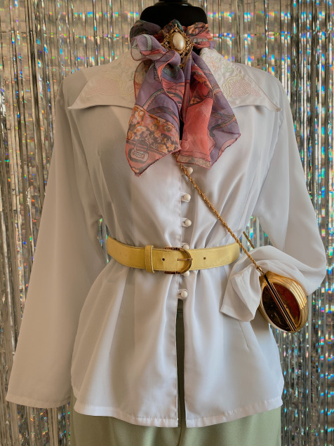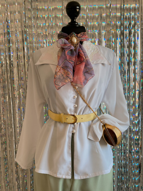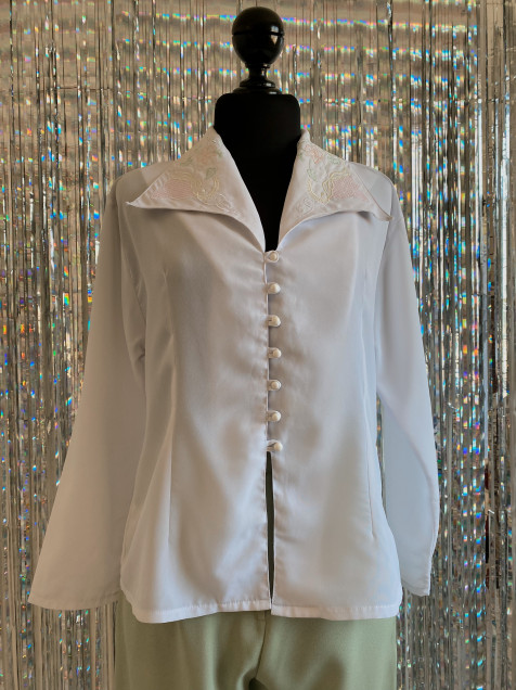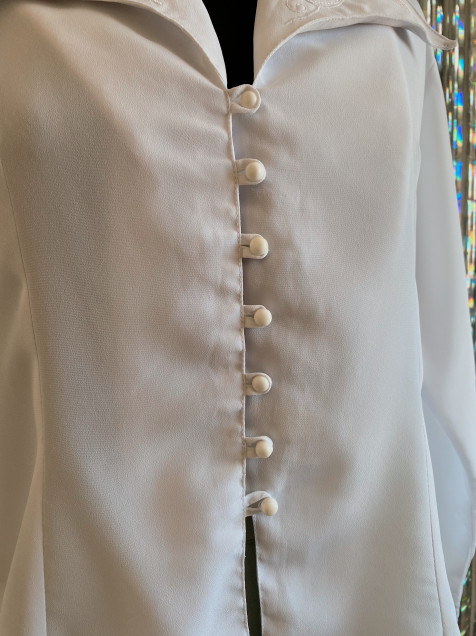 Blanca de manga larga , botones centrales blancos tipo Perla (ligeramente desgastados) y bordado floral en cuello. Tela polyester. Hombro: 40cm Manga: 55cm Ancho: 100cm Largo: 63cm