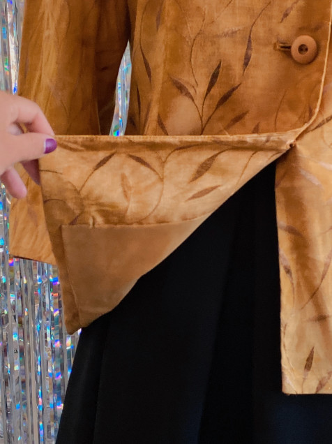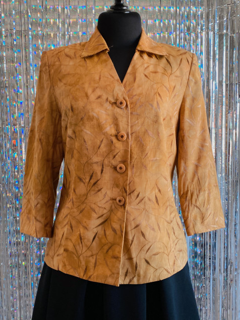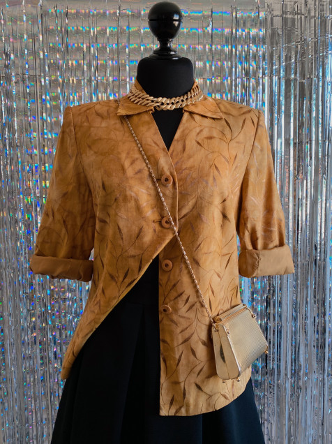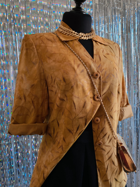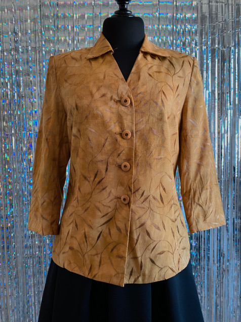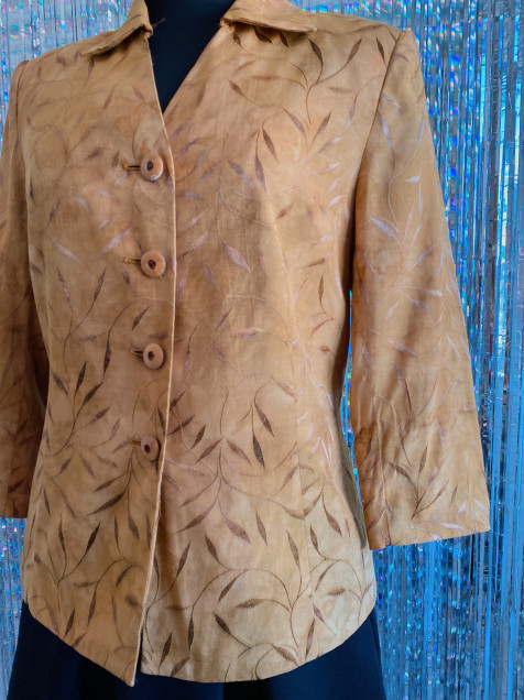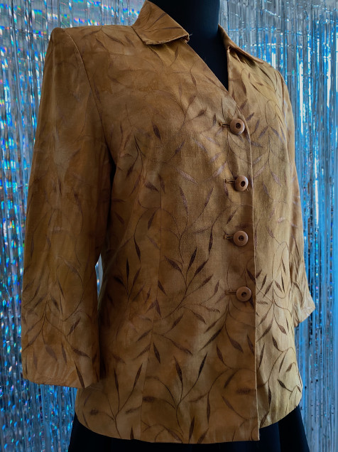 Blazer color mostaza de rayón y poliéster, mangas 3/4 , bordados dorados con diseño de hojas en reflejos satinados, botones centrales de madera. Tiene forro. Hombro: 41 cm Manga: 48 cm Ancho: 94 cm