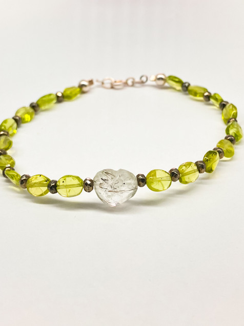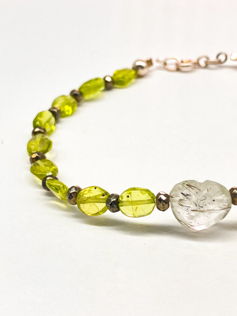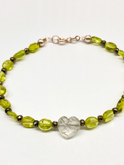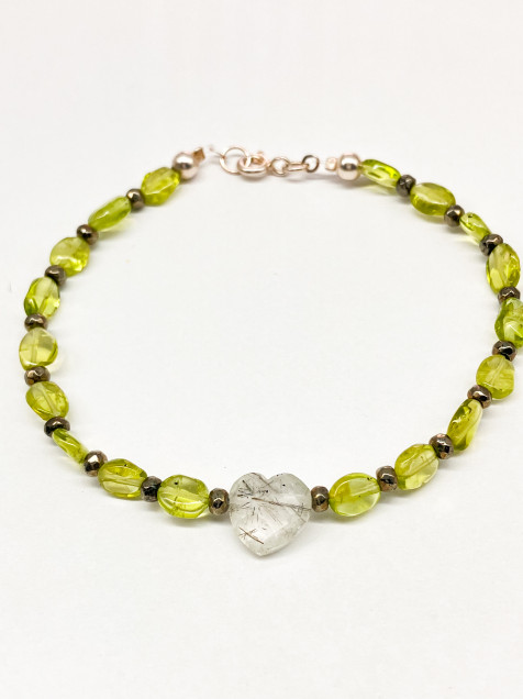Pulsera en genuinas piedras semi preciosas Peridoto ovalado de 4.5 mm, corazón tallado a mano en cuarzo rutilado de 9.5 mm, pirita rondelle de 2.5 mm y componentes en plata .925.