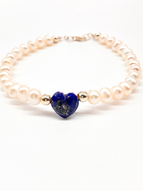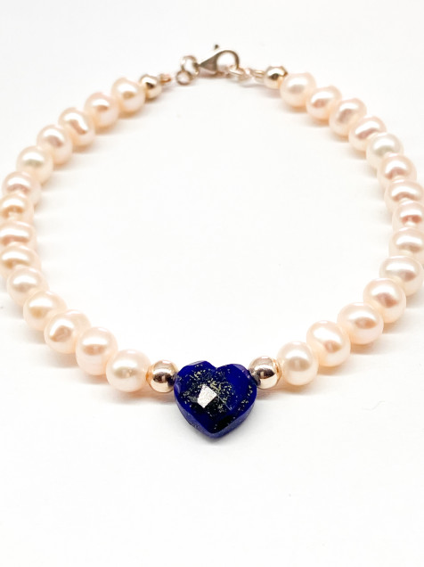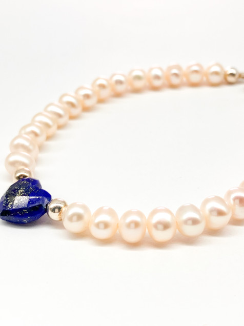 Perlas blancas de 5.6 mm, corazón tallado a mano en piedra lapislázuli facetado de 10 mm, componentes en plata .925