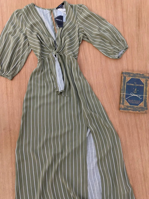 Maxi vestido verde a rayas con abertura al frente y cierre en espalda