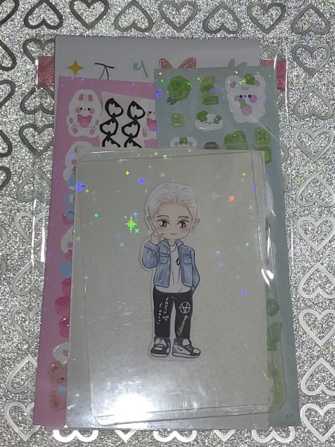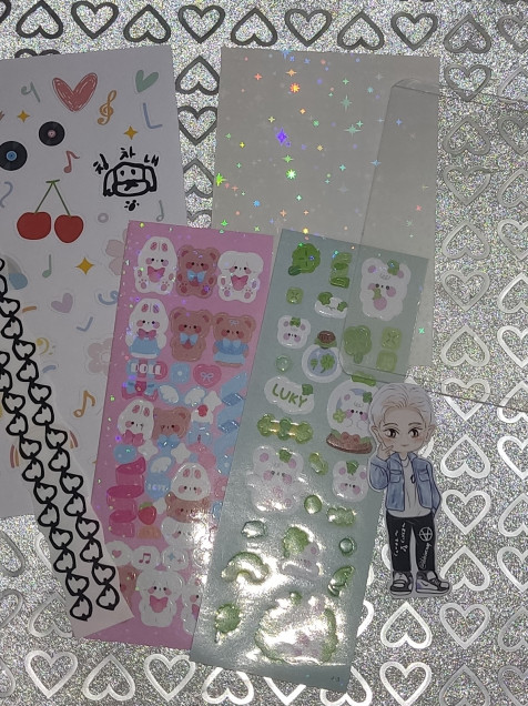 Incluye: 1 Toploader, 1 Film de Laminado de estrellas, 1 Plantilla de sticker Cherry Land, 2 tiras de sticker de cadenas corazón, 1 Sticker Loey y 2 Stickers random
