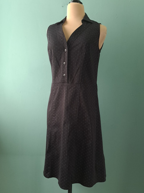 Vestido sin mangas, con botones en el pecho, falda de piezas. Mini polka dots, negro con blanco.
