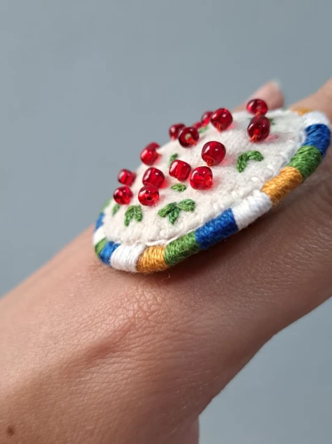 Anillo bordado a mano, inspirado en los chiles en nogada de CASAREYNA.