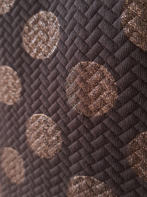 Vestido polka dots negro con puntos grandes dorado oscuro. La tela estira. Hace linda figura