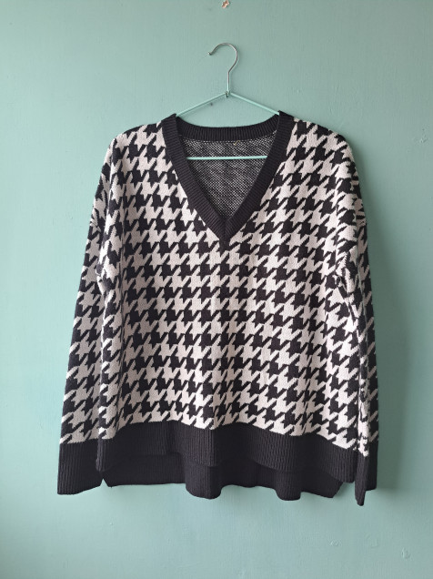 Suéter con tejido pata de gallo maxi, cuello V, blanco y negro. El corte es oversize pero solo en el pecho, de mangas es delgado por lo que queda a talla S o M/L de brazos delgados. En perfecto estado, no tiene bolitas ni hilos jalados.