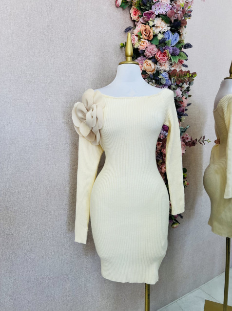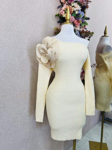Vestido Beige Manga larga, tela gruesa con detalle de flor