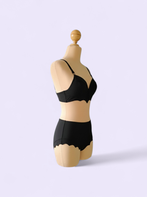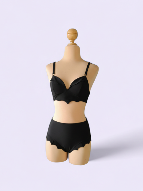 Este traje de baño negro, de dos piezas, con su diseño estilo murciélago, es ideal para un look gótico en tus vacaciones. El corte favorecedor te hará sentir cómoda y segura en la playa o alberca. ¡Perfecto para resaltar tu figura con un toque oscuro!