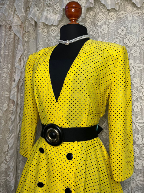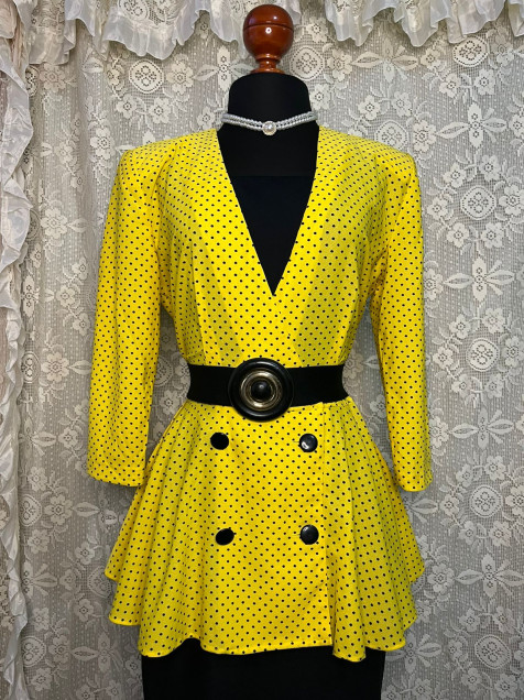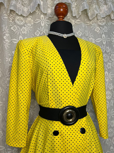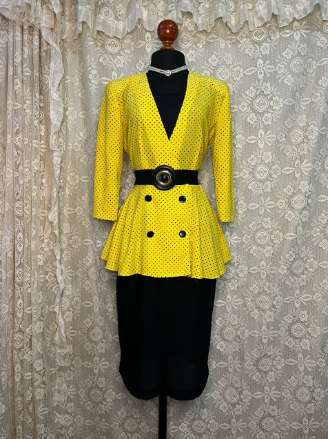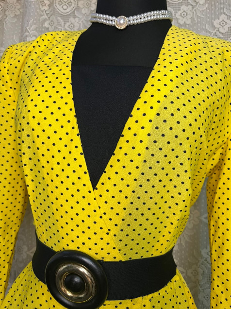 Su tono amarillo vibrante en combinación con el negro del polka dots, del cubre escote y de la falda es bellísimo, el corte peplum ideal para lucir caderas es espléndido y este vestido es especial me recuerda mucho a Nana Fine, siento que es algo que usaría sin dudas✨️
