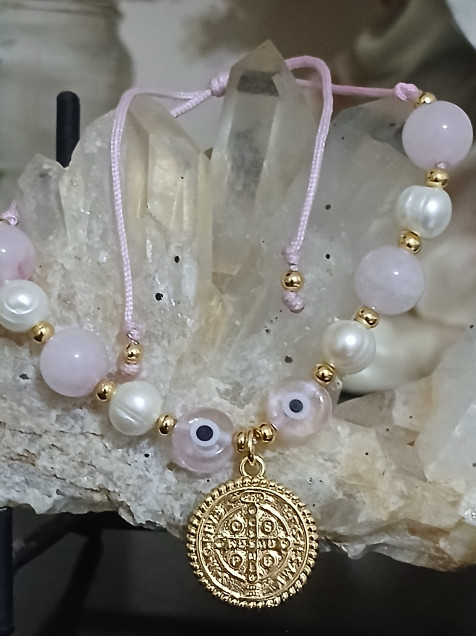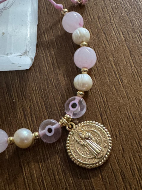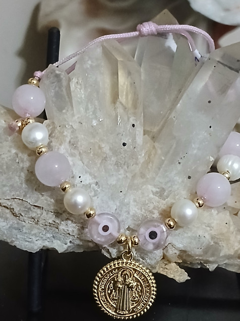 Material: cuarzo natural, perla de río, ojitos de protección y medalla San Benito
