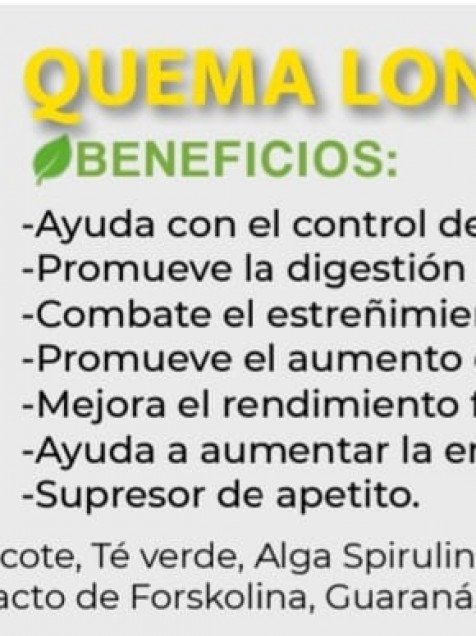 Ingredientes: Raíz de tejocote, té verde, alga espirulina, L-carnitina, garcinia cambogia, vinagre de manzana, guaraná, café verde, vitamina b12.