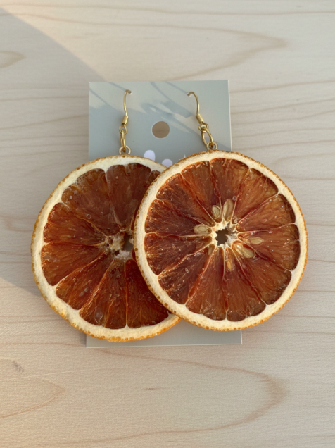 ¡Dale un toque fresco a tu outfit con estos originales aretes de naranja deshidratada en resina con toques dorados de acero inoxidable.