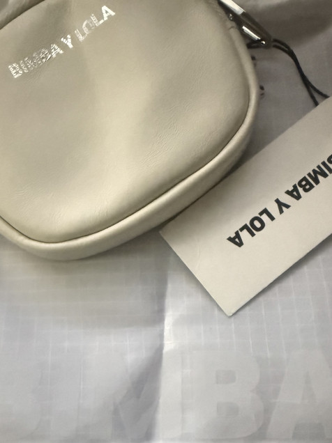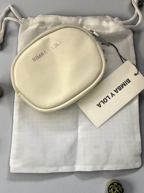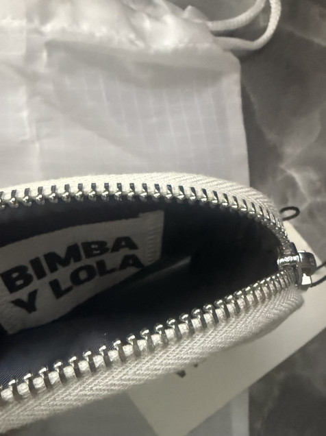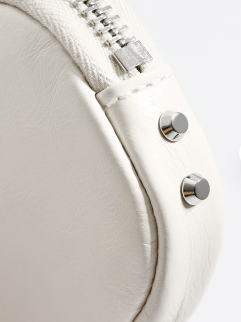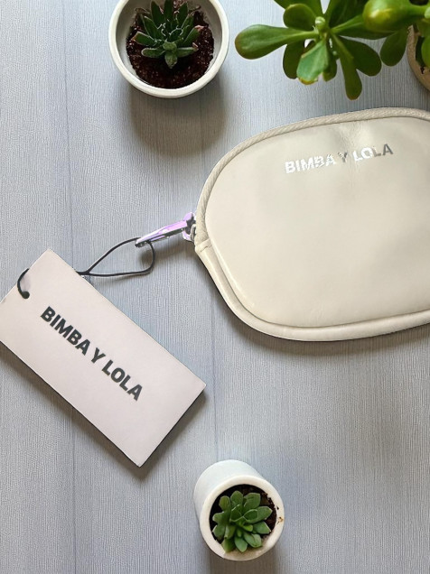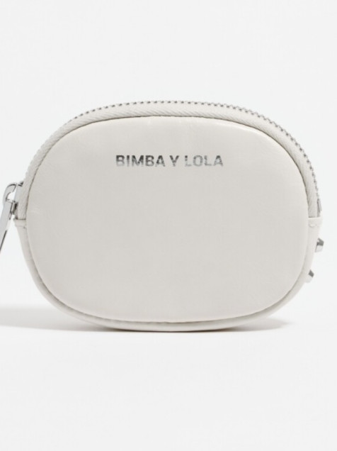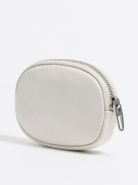 Monedero ovalado de piel en color marfil. Modelo con cierre de cremallera y tirador metálico. Exterior personalizado con logo. Incluye guardapolvo
