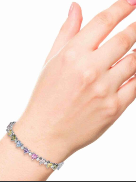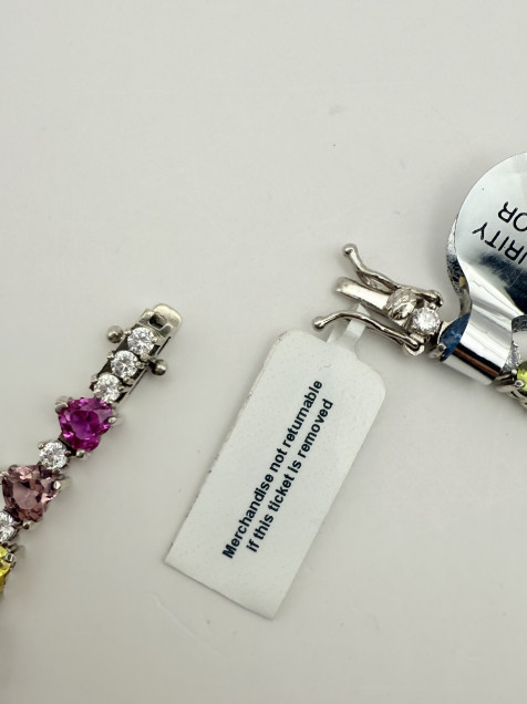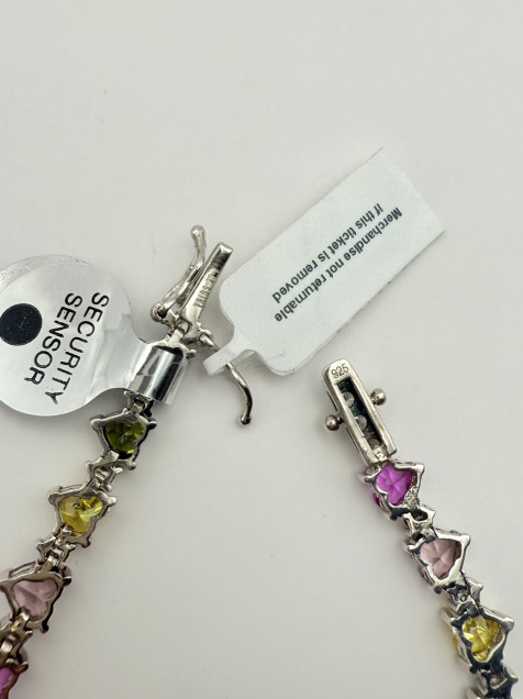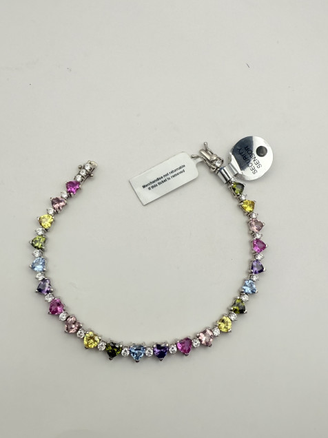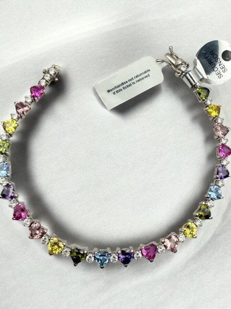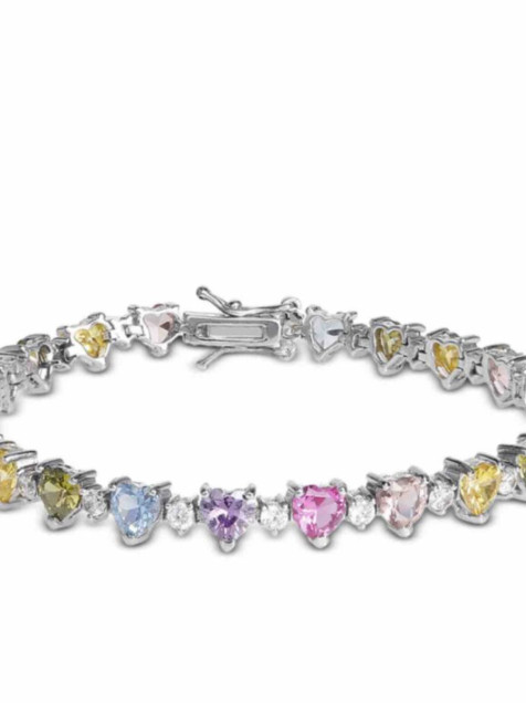 Brilla con esta pulsera multicolor de eslabones de corazón de zirconia cúbica de Giani Bernini. • Engastado en plata de ley • Tiene un precio de 160 dólares. Longitud aproximada: 18 cm.