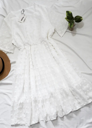 Hola mis bellas!!! Comensamos con este hermoso vestido blanco,cuenta con elastico en la cintura y en la tela un diseño hermoso con pompones que le da
