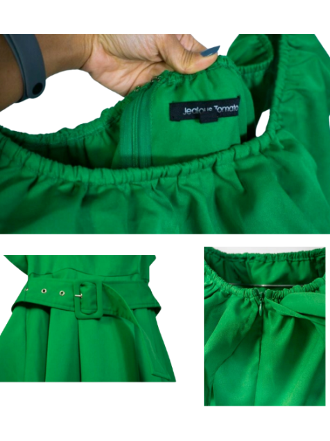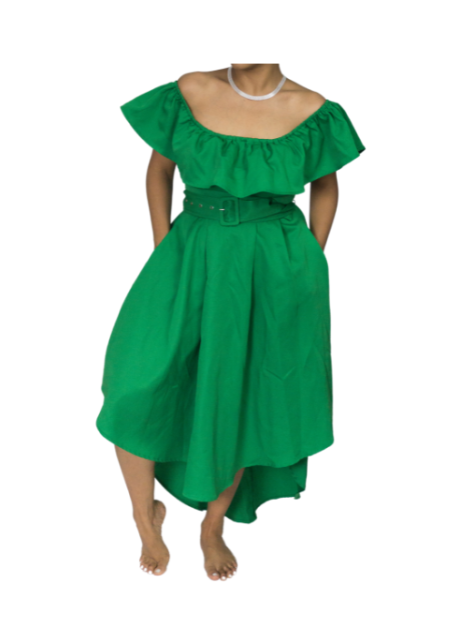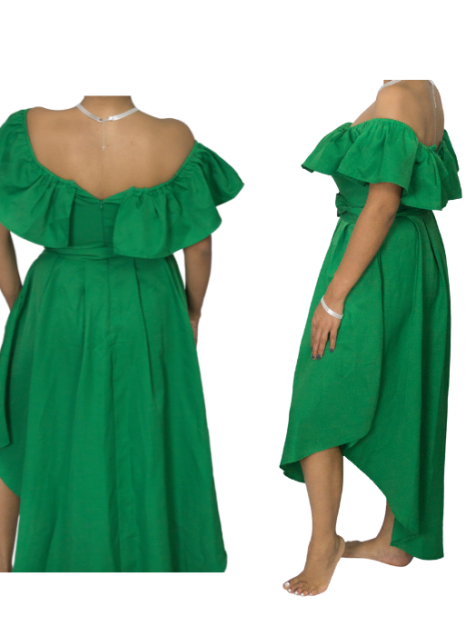 DESCRIPCIÓN: Vestido verde de hombres descubiertos, con bolsillos y caída irregular tipo cascada.
