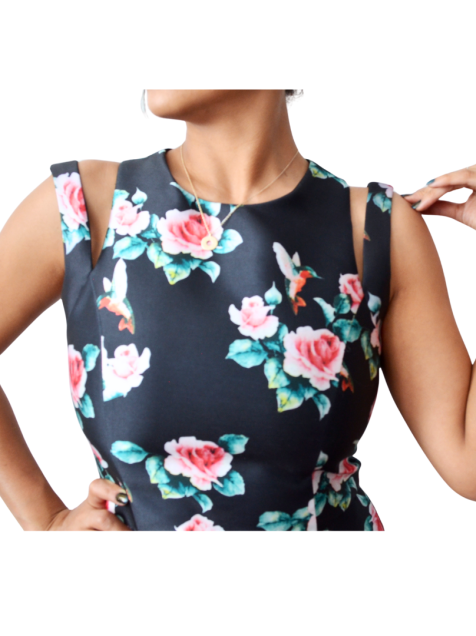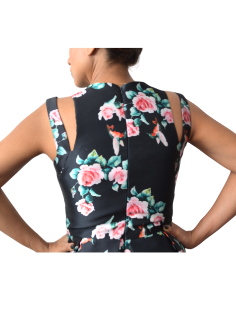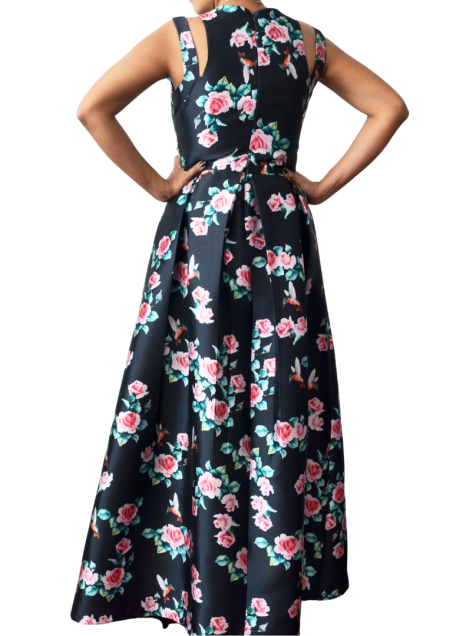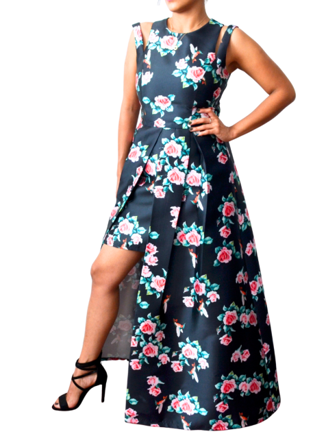 Vestido floreado, largo con abertura en medio que deja ver la mini falda de bajó. Lleva cierre invisible en la espalda. Tela tipo sarga.