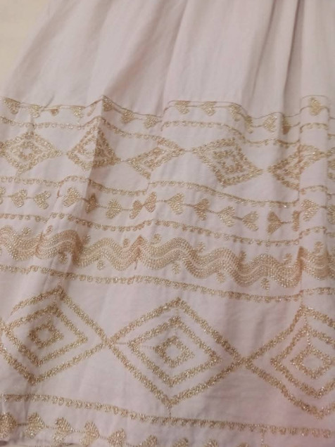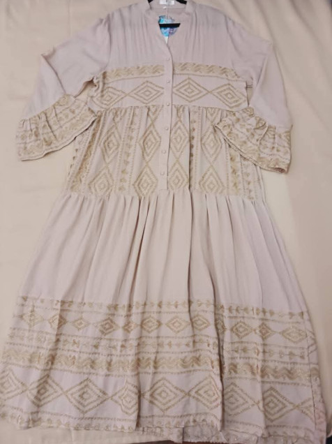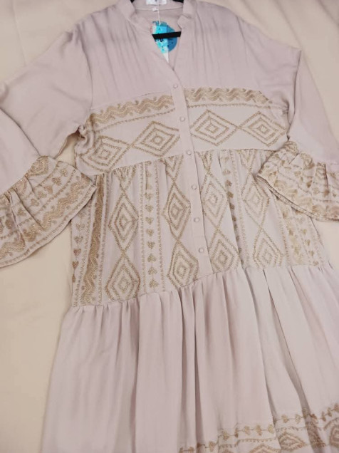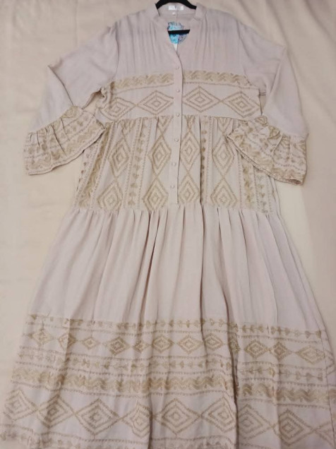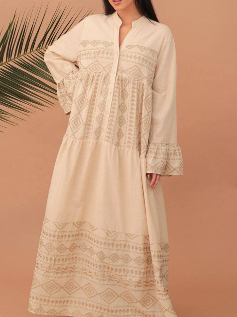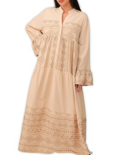 Luce fresca y chic con este maxi vestido color crema. Su diseño con sutiles estampados geométricos y mangas acampanadas te dará un toque boho muy cool. ¡Perfecto para un día relajado con mucho estilo!