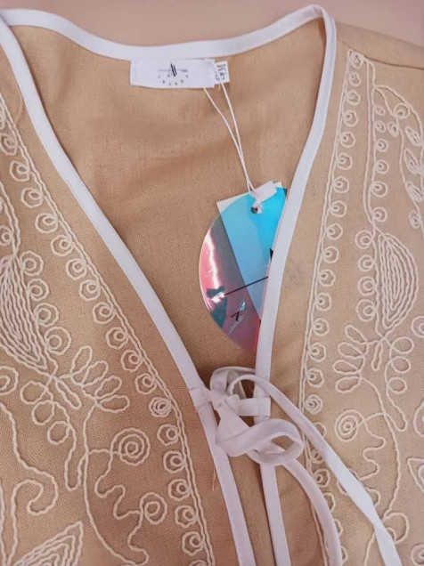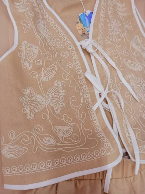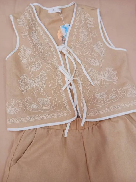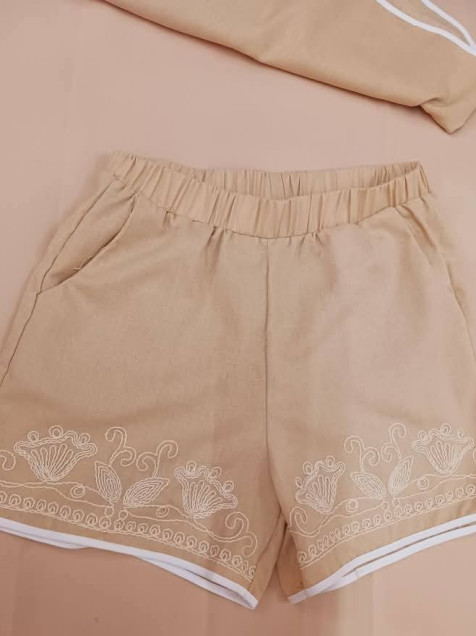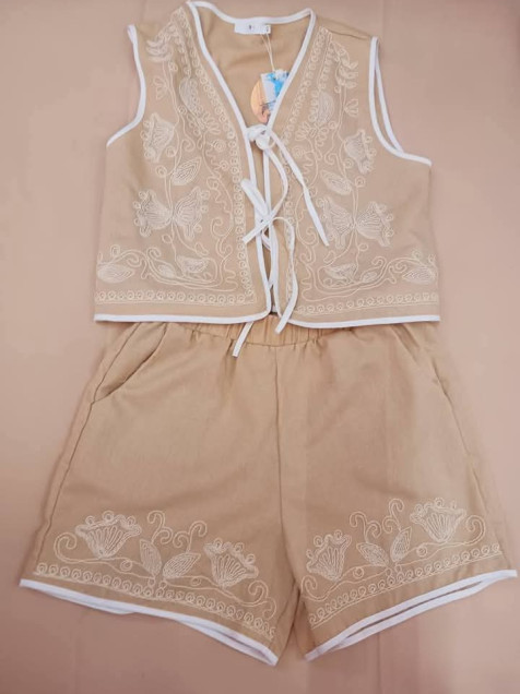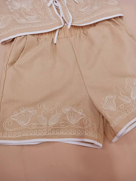 ¡Prepárate para brillar con este coqueto conjunto de top y short! En un delicado color arena con sutiles detalles bordados y ajuste con cintas, este conjunto te dará un look relajado pero chic. Perfecto para un día de sol o una tarde casual.