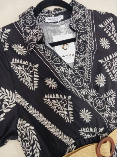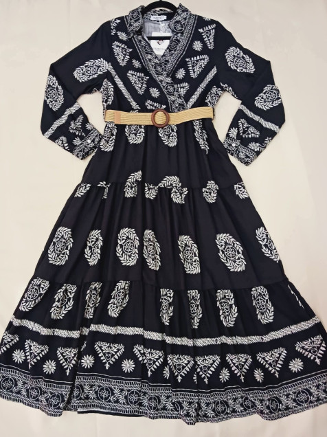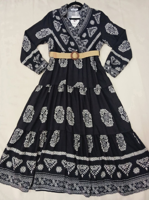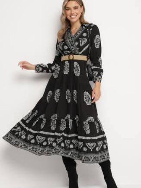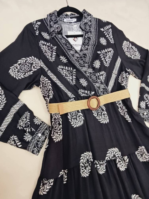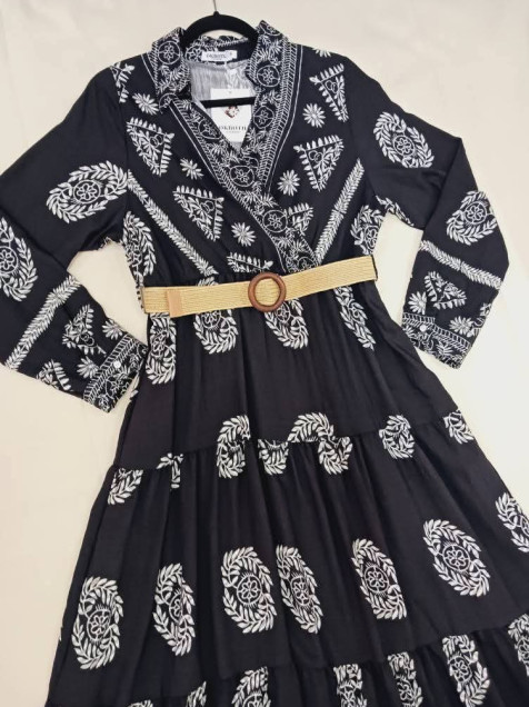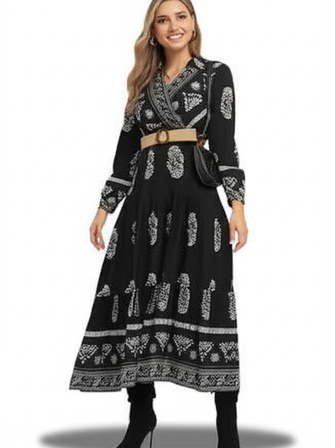 Eleva tu estilo con este maxi vestido con cinto. El estampado bohemio en blanco y negro le da un toque único, mientras que el cinto define tu figura. ¡Ideal para un look casual con onda!