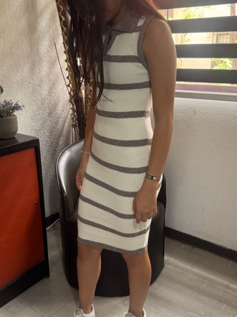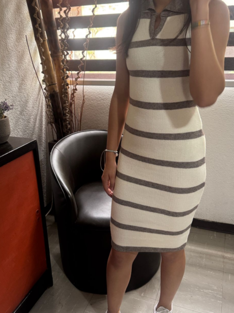 Vestido pegado, en color beige con franjas cafés, con cuello polo, talla CH.