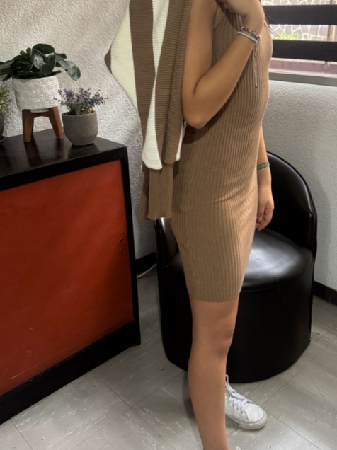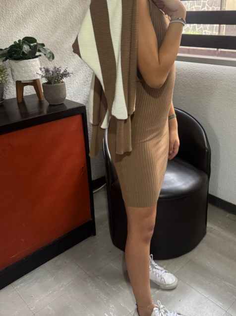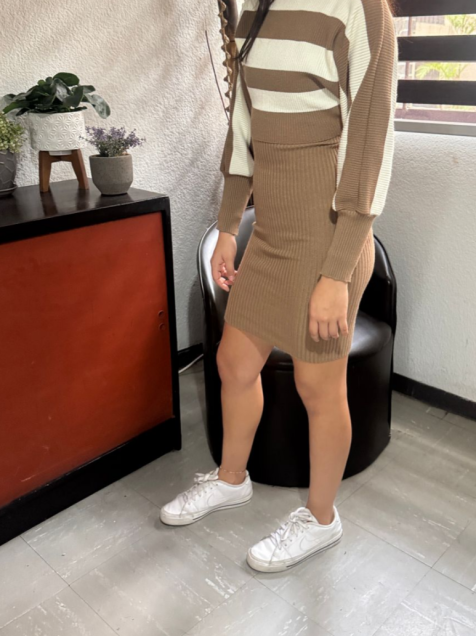 Vestido cafe pegado, con suéter de rayas en café con beige