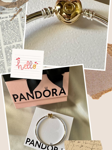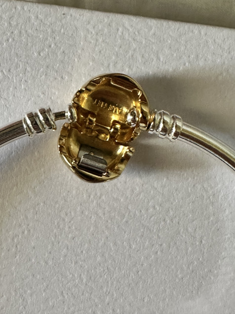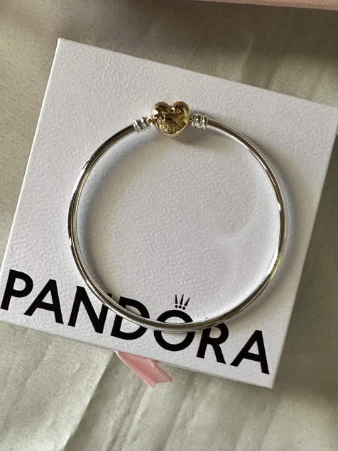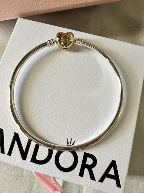 Brazalete Pandora de plata rígido con broche de corazón en dorado.