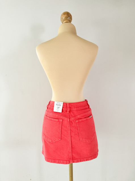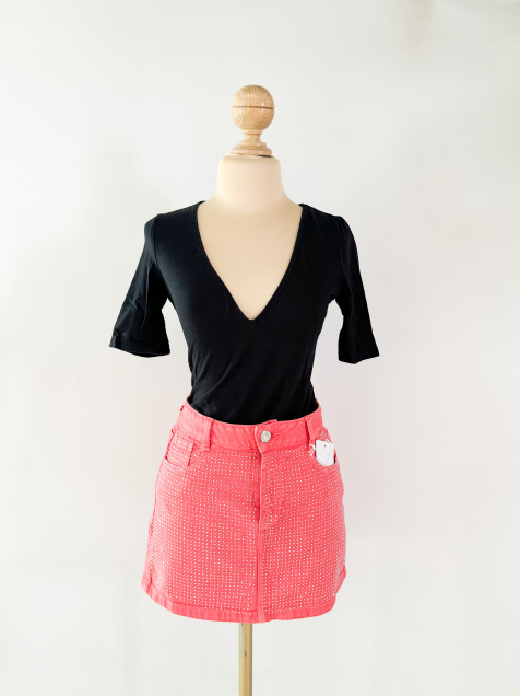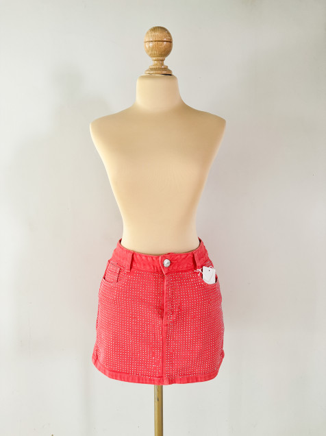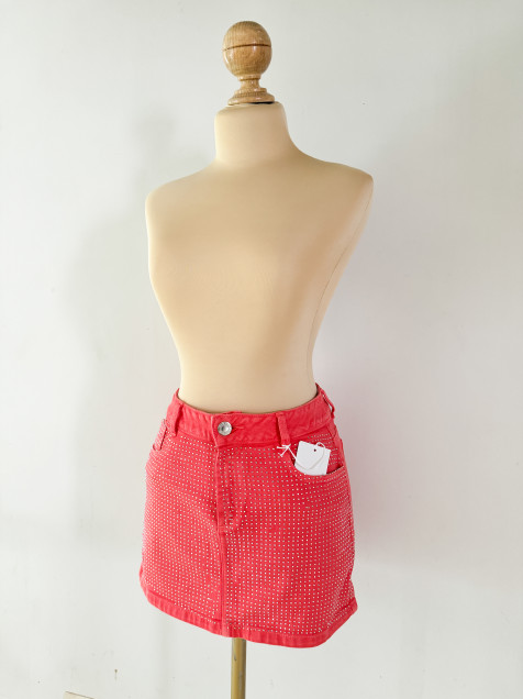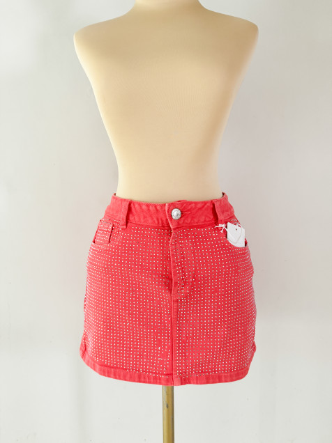 Minifalda de mezclilla en color naranja, con brillos en parte delantera, tiro medio, bolsas traseras y delanteras, pretina angosta de 1 botón y cremallera.