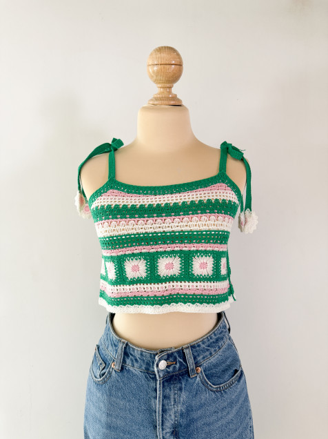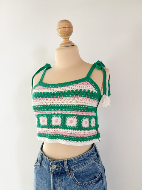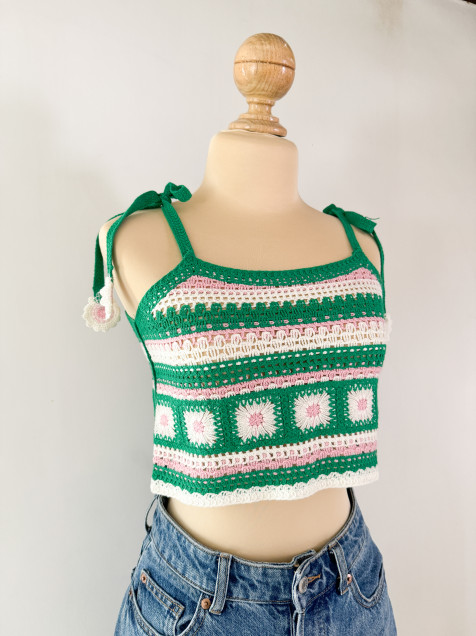 ¡Dale un toque boho a tu estilo con esta hermosa blusa de crochet! Su diseño lleno de color y detalles la convierte en la elección perfecta para un look fresco y original.