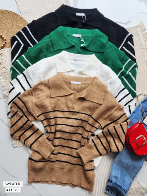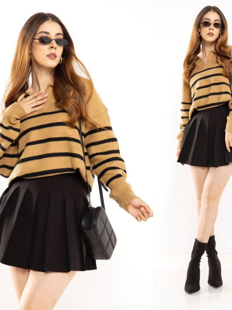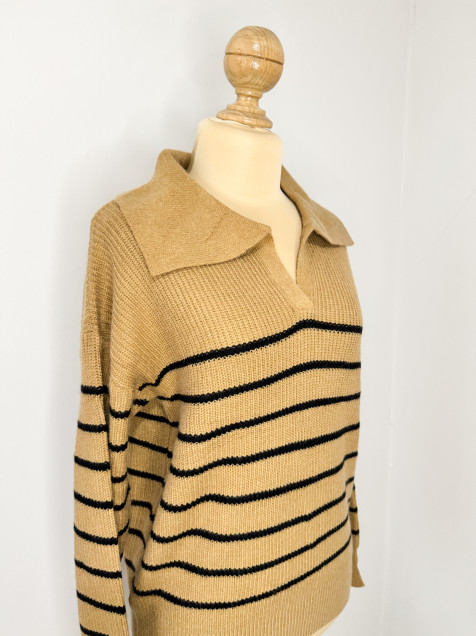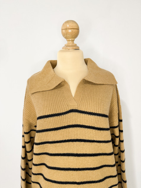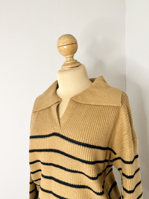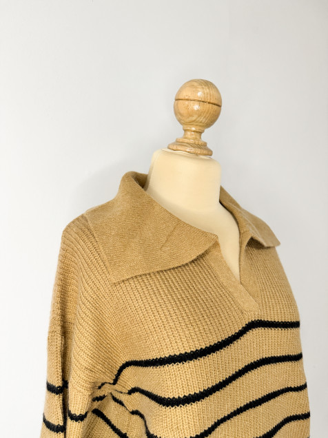 SuĂ©ter de punto en tono camel. Con su diseño de rayas horizontales y cuello tipo polo, es una prenda versátil ideal para los dĂas más frescos❄️. Un básico imprescindible para mantenerte abrigada sin perder el estilo.