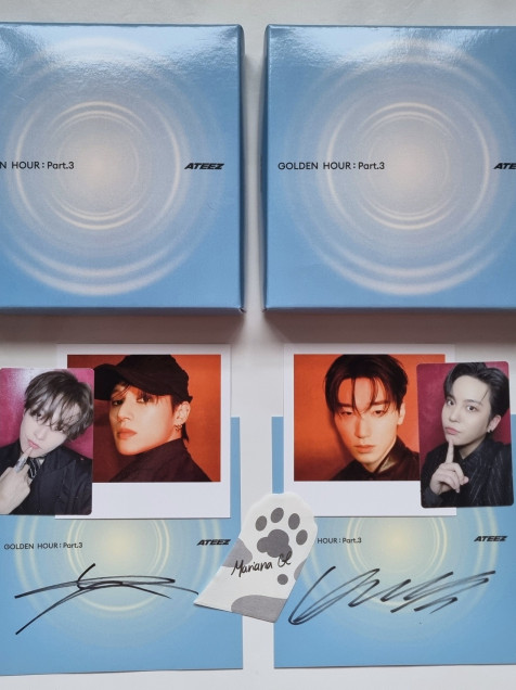 Firma de Yunho (izquierdo), polaroid de San (derecho) y photocard de Wooyoung (izquierdo).