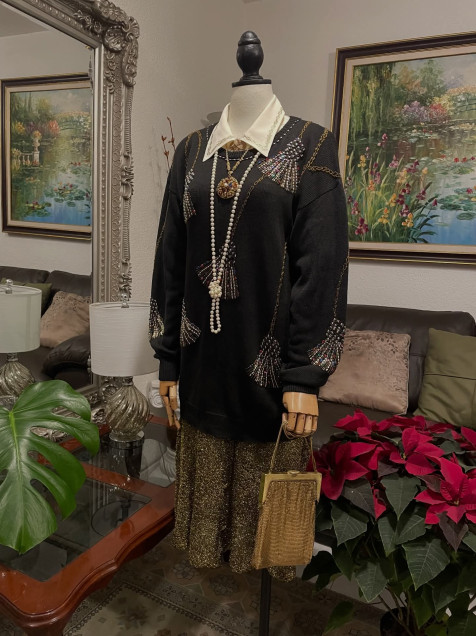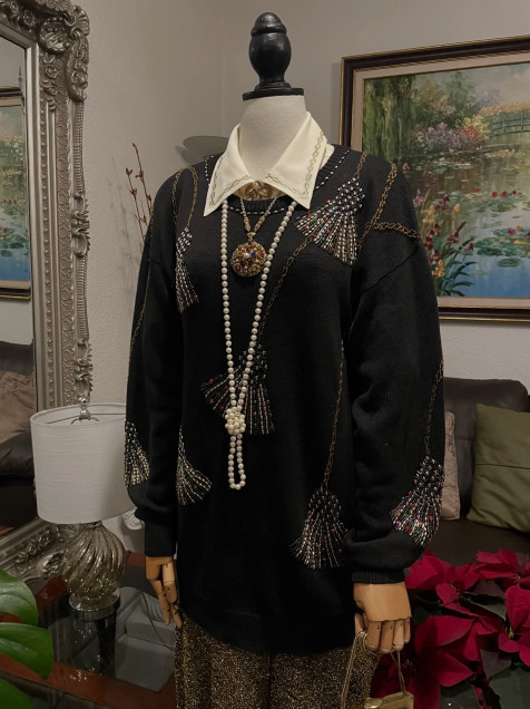 Perfecto para ugly sweater parties, posadas, looks retro 80s, fotos virales y coleccionistas de beaded vintage.