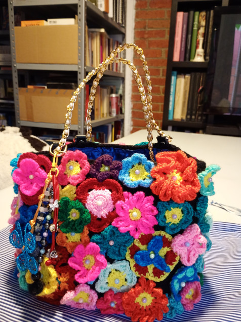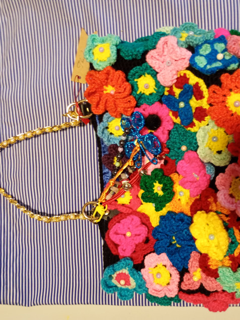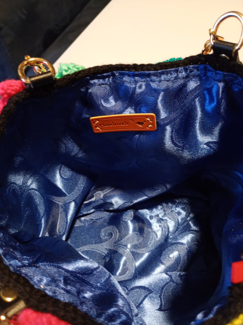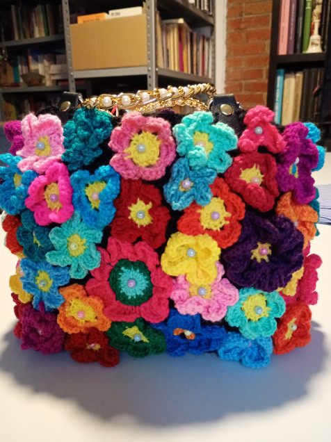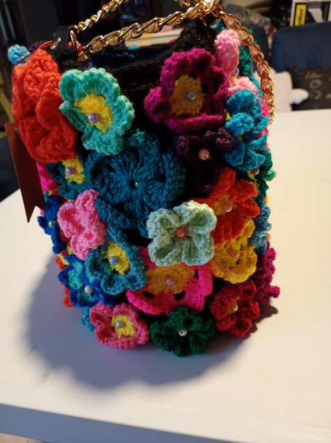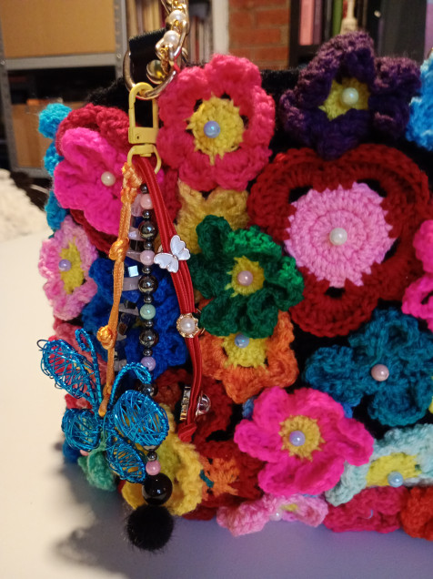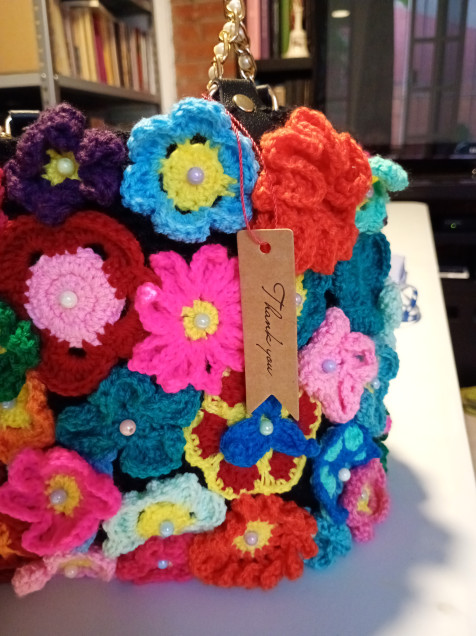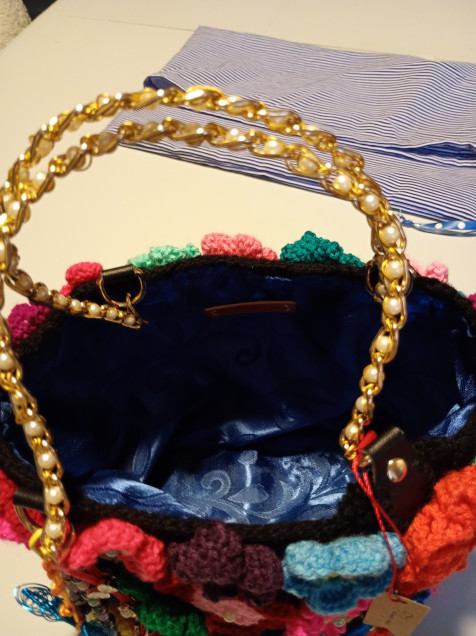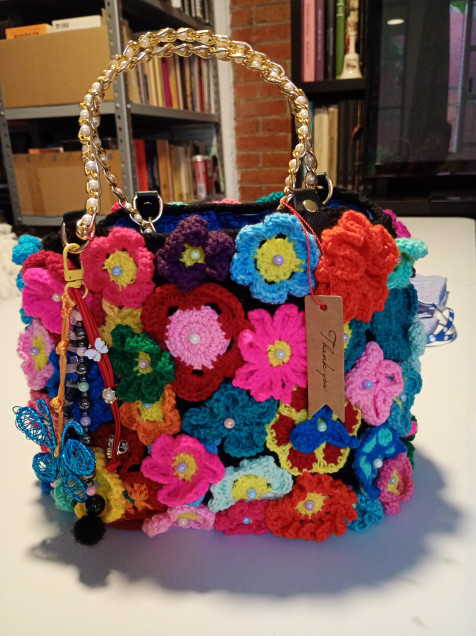 Base completamente tejida a crochet con flores realizadas una por una. Tiene cerca de 10 tipos de flores. Base de vinipiel. Completamente forrada con tela satinada. Asas de cadena con perlas reforzadas con hilo metálico flexible para mayor comodidad y resistencia. Bolsa tipo Tote de forma oval, mide aproximadamente 25x12cm. Incluye cubrepolvos y llavero con colguijes.