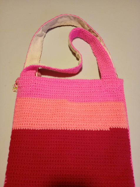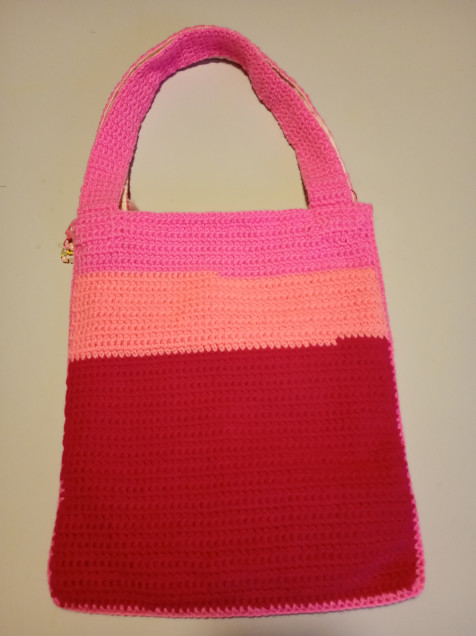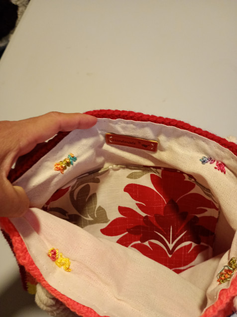 Tejido con patrón con flores en relieve. Completamente forrada y con bolsillo interior. Asas reforzadas para mayor resistencia, de 57cm. Mide 28cm de ancho por 34cm de alto. Se envía con cubre polvo y llavero de colguijes.